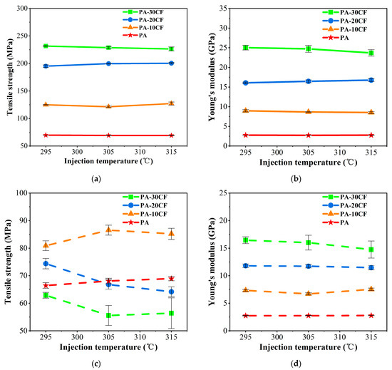 Tensile properties of PA-CF composites for different fiber contents and injection temperatures: (a) tensile strength, without weld lines; (b) Young’s modulus, without weld lines; (c) tensile strength, with weld lines; and (d) Young’s modulus, with weld lines.