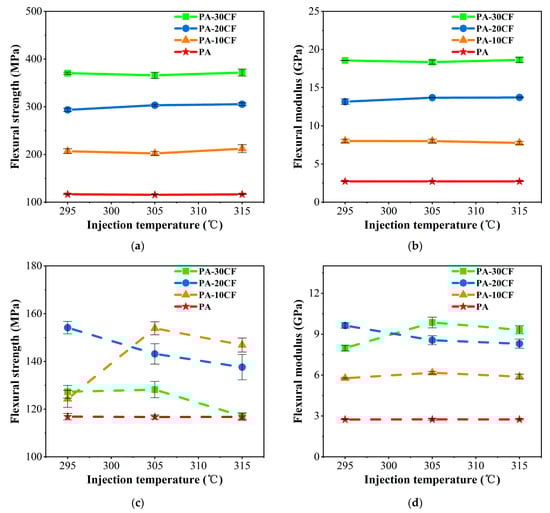 Flexural properties of PA-CF composites were also measured for different fiber contents and injection temperatures. Similar to tensile properties, the flexural strength and flexural modulus of PA-CF composites without weld lines significantly increased with the rise of fiber content for specimens, as shown in Figure 7a,b. The flexural strength and flexural modulus of PA-CF composites increased by 3.18 and 6.81 times, respectively, compared to pure nylon (injection molding at 295 °C) when carbon fiber reached 30wt%. The injection temperature had a negligible influence on the flexural strength and modulus of PA-CF composites without weld lines as well.