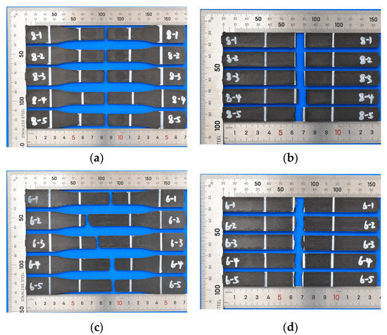 As the weld lines were the weak regions of specimens, their existence would affect the failure mode of the PA-CF composite. The fracture of specimens tended to occur close to the weld lines, as shown in Figure 8a,b. The fracture was relatively flat, and there were almost no small fragments produced by damage, indicating that weld lines were weak regions of material properties. The failure positions of specimens without weld lines are shown in Figure 8c,d. The fracture position was randomly located in the gauge length with a rough fractural surface and small fragments produced during the damage.