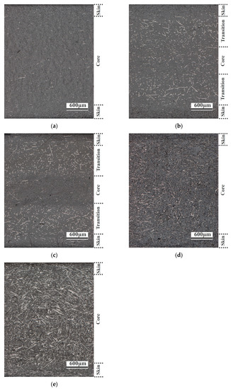 Metallographic micrograph (a) without weld lines, PA-10CF, 305 °C; (b) with weld lines, PA-10CF, 295 °C; (c) with weld lines, PA-10CF, 305 °C; (d) with weld lines, PA-30CF, 295 °C; and (e) with weld lines, PA-30CF, 305 °C.