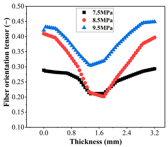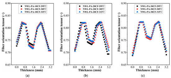 The fiber orientation tensor could describe the probability of fiber orientation in a specified principal direction. A value close to 1 indicates a high probability of fiber orientation in the specified principal direction, while a value close to 0 indicates a low probability. The distribution of fiber orientation tensor components in the length direction of specimens obtained by simulation is shown in Figure 11, and the tensors were approximately symmetrical along the thickness direction. The orientation tensors of samples without weld lines are shown in Figure 11a–c. During the transition from the skin layer to the core layer, the orientation tensors first increased and then decreased, which was similar to the results of many previous studies [37,38]. The skin layer contacted the cavity, and the lower temperature during the filling process led to rapid condensation of the melt, which was not conducive to fiber reorientation. However, the core layer had a higher temperature, resulting in better melt fluidity, and the fibers were subjected to complex shear effects, which were not conducive to the orientation of the fibers along the flow direction. As the fiber content increased, the interaction between fibers became more pronounced, and the tensors of the skin layer decreased as the fiber content increased, while the core layer exhibited the opposite behavior. The injection temperature hardly influenced the fiber orientation tensors.