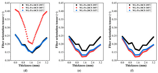 Fiber orientation tensors of specimens with/without weld lines for different injection temperatures: (a) without weld lines, PA-10CF; (b) without weld lines, PA-20CF; (c) without weld lines, PA-30CF; (d) with weld lines, PA-10CF; (e) with weld lines, PA-20CF; and (f) with weld lines, PA-30CF.