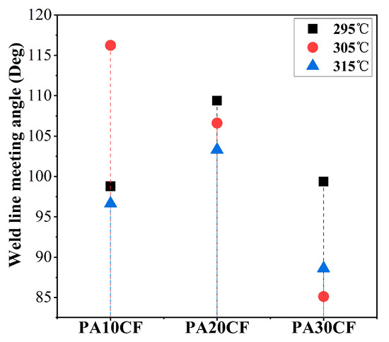 It was reported that the weld line meeting angle was related to the fiber orientation and mechanical properties of specimens [2]. Generally, a larger meeting angle causes higher mechanical properties and a more inconspicuous appearance of the weld line. The simulation results of the weld line meeting angle of PA-CF composites are exhibited in Figure 12. PA-10CF composites achieved the largest meeting angle at 305 °C, and PA-20CF and PA-30CF achieved the largest meeting angle at 295 °C. Larger weld line meeting angles corresponded to better mechanical properties as well.