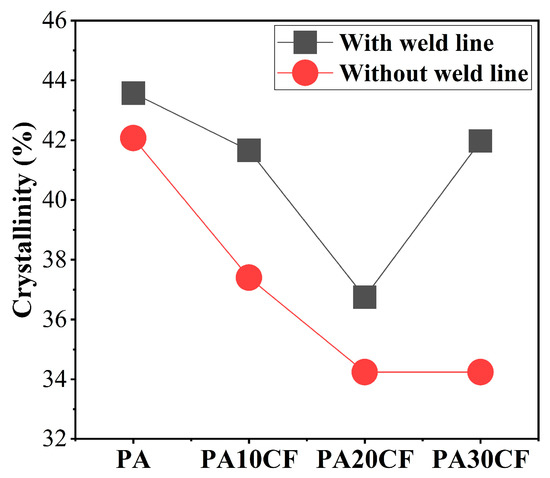 In addition to the fiber orientation, the crystallinity of nylon in the weld line regions was also investigated. The results obtained by DSC measurement are shown in Figure 13. Generally, the crystallinity of nylon in the samples with weld lines was higher than those without weld lines, indicating that the presence of weld lines promoted the crystallization of nylon. However, the mechanical properties of the samples with weld lines were still lower than those without weld lines. Combined with the previous microstructure analysis, it was shown that fiber orientation played a decisive role in the mechanical properties of composites.