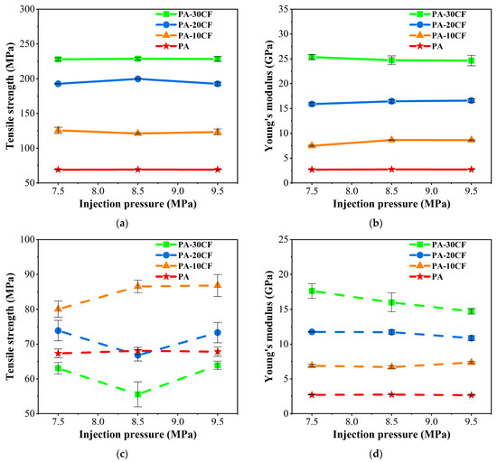 Tensile properties of PA-CF composites for different injection pressures: (a) tensile strength, without weld lines; (b) Young’s modulus, without weld lines; (c) tensile strength, with weld lines; and (d) Young’s modulus, with weld lines.