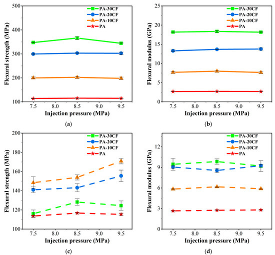 Flexural properties of PA-CF composites for different injection pressures: (a) flexural strength, without weld lines; (b) flexural modulus, without weld lines; (c) flexural strength, with weld lines; and (d) flexural modulus, with weld lines.