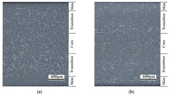 As shown in Figure 16, to further analyze the influences of injection pressure on microstructure, microscopic images of PA-10CF composites at 7.5 MPa and 9.5 MPa in weld lines regions were observed, showing the structure of the skin–transition–core. It is worth noting that the fibers in the transition layer tend to orient along the flow direction when injection pressure increases, which is beneficial for improving mechanical properties. The transition layer had a significantly better fiber orientation at 9.5 MPa (Figure 16b) than at 7.5 MPa (Figure 16a). The simulation also confirmed this result (Figure 17), indicating that higher injection pressure was conducive to fiber orientation in the weld line region.
