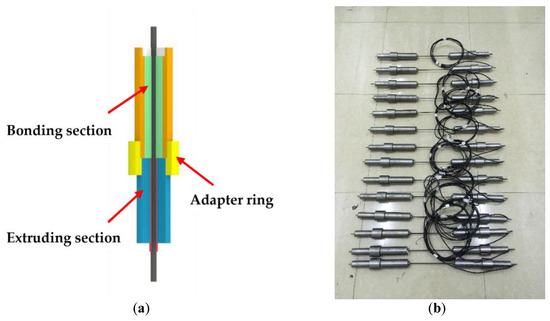 As a result of the anisotropic and weak-shear properties of CFRP rods, however, the anchoring performance has a significant effect on the ultimate bearing capacity (UBC) and fatigue resistance of CFRP cable [6,7,8,9,10,11]. The anchoring effect causes premature fiber breakage due to lateral shear stress or local fiber bending induced by adhesive and, in the worst-case scenario, leads to compression-shear fracture of the CFRP rod in the anchoring section. Consequently, over the past 20 years, numerous novel anchors have been proposed, and substantial experimental and numerical studies have been conducted to reduce the damage concentration of CFRP rods in the anchoring system. Zhang et al. [6] and Mei et al. [7] proposed a straight and a straight-inner cone bonding anchor, respectively, to diminish the compression stress on CFRP rods by optimizing the inner structure of the anchoring cup; Meier et al. [8] and Wang et al. [9,10] adopted gradient stiffness adhesives and continuous-fiber-reinforced load transfer component (LTC) to reduce the compression stress on CFRP rods near the loaded end of the anchoring section. The aforementioned studies reveal the damage mechanism of CFRP rods due to anchoring, and the findings become fundamental for the applications of CFRP cables.