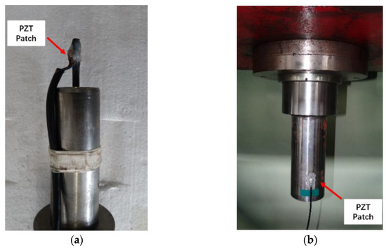 An electromagnetic interference (EMI)-shielded lead zirconate titanate (PZT) patch (Baoding Yitian Ultrasonic Technology co., LTD, Baoding, Hebei, China) [17] was used as the AE sensor. During AE monitoring of the CFRP rods, the PZT patch was attached to the CFRP rod behind the friction section (no strain during the fatigue loading), as shown in Figure 4a. Thus, the AE monitoring results could reflect the damage caused to the CFRP rod. Moreover, during AE monitoring of the fatigue damage caused to the CFRP cables, the PZT patch was attached to the anchoring cup of the CFRP cable to obtain the AE signals, as shown in Figure 4b. The Physical Acoustic Corporation (Princeton, NJ, USA) DiSP-4/PCI system with digital passband filters (10 kHz–2 MHz), which cover all frequency ranges related to the damage patterns in CFRP materials, was employed. The system preamplifier was set to a 40 dB gain, and the acquisition trigger threshold was set to 42–45 dB (for the CFRP rods) and to 52–55 dB (for the CFRP cables). This arrangement could filter out any EMI generated by the fatigue testing machines at a zero-fatigue load.