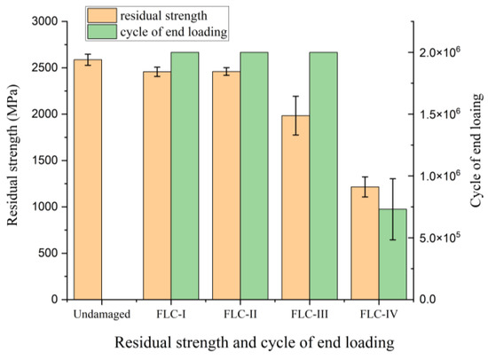 As shown in Figure 7, the large variation in the residual strength of the CFRP specimens under FLC-III (all specimens were loaded for two million cycles) obviously reveals the unstable fatigue resistance of the CFRP rods since the residual strength of the CFRP specimens is largely related to the degree of fatigue damage. On the other hand, for the same level of reduced fatigue stiffness, the variation in the residual strength of the CFRP specimens under FLC-IV is smaller than that under FLC-III, indicating no significant difference in the degree of damage caused to the CFRP specimens under FLC-IV. However, the degree of damage caused to these CFRP specimens was obtained after applying quite different loading cycles, which also reveals the unstable nature of the CFRP rod fatigue resistance.