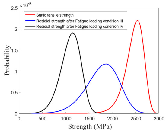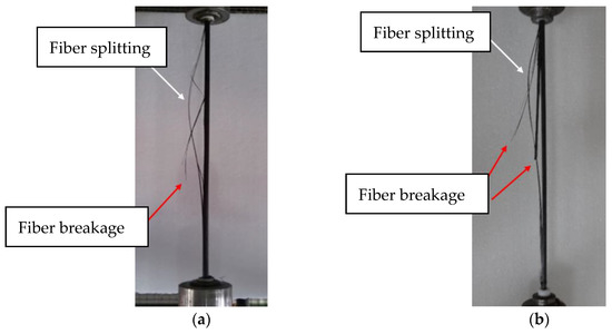 Figure 6 shows the macroscopic fatigue-damage progression of the CFRP rod under FLC-IV. As shown in Figure 6a, the initialization of macroscopic fatigue damage concentrated in the free section of the CFRP rod, causing fiber splitting (shown in white arrows) and fiber breakage (shown in red arrows) [29,30]. Figure 6b shows the fatigue failure of the CFRP specimens (with a 30% loss in stiffness). It was found that all of the fatigue damage distributed in the free section of the CFRP specimen and the fatigue-failed CFRP specimens still exhibited a certain amount of residual strength. Consequently, the residual strength of all CFRP specimens was examined. The results showed that only the CFRP specimens under FLC-III and IV sustained significant residual-strength loss. Then, the two-parameter Weibull model was used to evaluate the probability distributions of the residual strength of the CFRP specimens under FLC-III and IV, as shown in Figure 7.