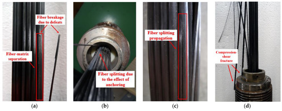 In the early stage (cycle from the beginning to the 1/3 of fatigue life) and intermediate stage (cycle from the 1/3 to the 2/3 of fatigue life) of the fatigue loading, the observed predominant damage mode in cable #2 is fiber splitting, which is prompted by the complex stress exerted on the CFRP rod in the anchoring section. As shown in Figure 8b,c, this damage mode starts in the anchoring section and progressively spreads to the free section of the cable. It may eventually separate the CFRP rod into several parts as fiber splitting propagates. Notably, the fiber splitting induced by the anchoring section affects the stiffness of the CFRP rod and intensifies the nonuniform distribution of stress among the CFRP rods. As a result, the bending of the CFRP cable and resulting shear further affect premature fiber breakage in CFRP rods. During the late stage of the fatigue-loading process, an asymptomatic compression-shear fracture of the CFRP rods in the anchoring section was observed, as shown in Figure 8d. Furthermore, all CFRP rods fractured in compression-shear mode also suffer severe fiber splitting. Therefore, it is reasonable to conclude that the degree of fiber splitting correlates closely with the level of premature fiber breakage.