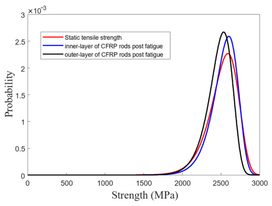 The residual strength of these CFRP rods was tested, and the results described by the two-parameter Weibull model are presented in Figure 10. It is clearly observed that the residual strength of CFRP rods was not severely compromised, indicating that the CFRP rods at the free section of the cable were not affected by damage progression from the anchoring section.