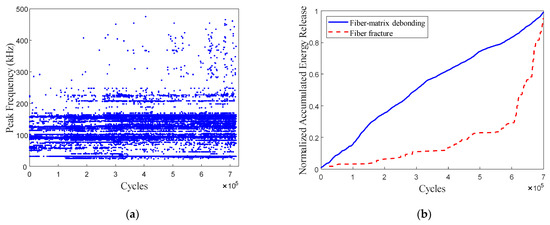(a) AE peak frequency vs. fatigue-loading cycle under FLC-IV. (b) Normalized accumulated AE energy release due to critical damage patterns vs. fatigue-loading cycle under FLC-IV.