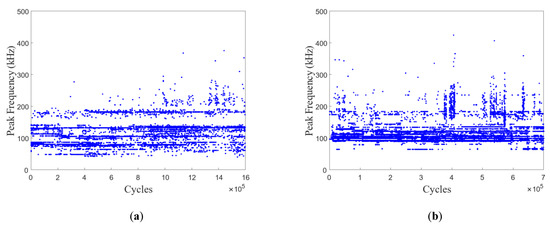 As shown in Figure 4a, the obtained AE monitoring signals reveal the microscopic damages to the CFRP rod in the anchoring section. Therefore, the damage patterns in the AE signal can be identified using AE frequency analysis because of the inherent relationship between the AE peak frequency distribution and the microscopic damage patterns. Moreover, studies on the microscopic damage caused to FRP materials have shown that fiber-matrix debonding and fiber breakage are the main causes that affect the macroscopic properties of FRP materials (cited as critical damage patterns). Thus, the accumulated AE energy release due to critical damage patterns was adopted to assess the damage progression in the CFRP rod due to fatigue loading. In this section, the peak frequency of AE signals obtained under various fatigue loading conditions was analyzed using the fast Fourier transform to associate the damage patterns in the CFRP rod.
