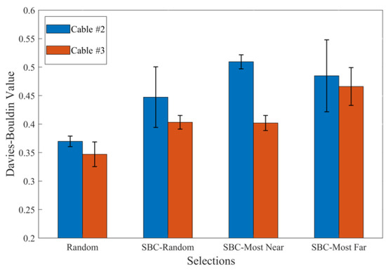 Because the AE sensor was attached to the anchoring section cup (Figure 4b), it is important to note that the obtained AE signals were attenuated, which altered their frequency-domain characteristics. Therefore, AE frequency analysis could not be used to identify the damage patterns in the CFRP rods in the anchoring section. Based on the current research, the obtained AE signals were produced by the cracking of the adhesive and the damage caused to the CFRP rods, such as matrix cracking, fiber-matrix debonding, and fiber breakage. To determine the progress of the complex multi-mode damage observed in the anchoring section, the component-scaled AE monitoring results were analyzed using a cluster-based pattern recognition method. However, it was found that the number of AE signals caused by fiber breakage and fiber-matrix debonding is relatively low compared to the matrix cracking in CFRP rod and potting compound cracking (i.e., severely imbalanced class distributions in the AE signals). This study uses k-means clustering to identify damage patterns, which is highly sensitive to the degree of imbalanced class distributions in the AE signals. The k-mean clustering method is incapable of identifying damage patterns with only a small amount of AE signals (fiber breakage and fiber-matrix debonding), leading to unreliable clustering results. The subsequent procedures were, therefore, applied to the AE monitoring results. The AE primary peak frequency and logarithmic energy distributions in the frequency domain were employed as the AE feature vector to construct an AE dataset [17]. Then, several undersampling approaches were adopted to diminish the impact of the imbalanced class distribution in the AE dataset and improve the clustering quality. Clustering results using different undersampling approaches were evaluated using Davies-Bouldin values (i.e., the smaller the value, the better the separation effect), as shown in Figure 15.