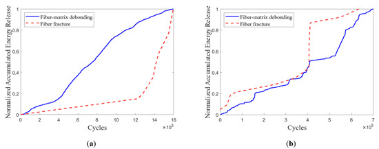 Figure 13 presents the AE monitoring of a typical CFRP specimen under FLC-IV. Figure 13a demonstrates that critical damage patterns released a significant amount more AE signals, and the AE hit in the time domain gradually increased during the fatigue-loading process. In Figure 13b, the accumulated AE energy release as a result of fiber breakage showed a gradual rise in the early stages of the fatigue-loading process and then a sharp rise. The trend of accumulated AE energy release due to fiber breakage corresponded with the progression of fiber breakage in the theoretical three-phase fatigue-damage model for the FRP under axial-fatigue loading.