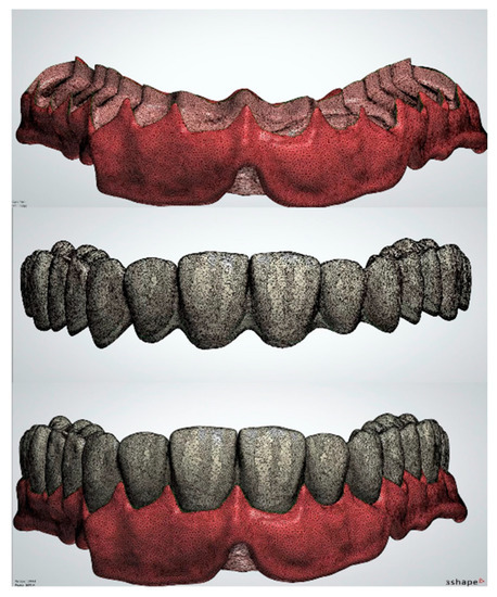 During conventional denture fabrication, the bonding between denture bases and teeth occurs through PMMA polymerization in contact with the artificial teeth and the creation of an interwoven polymer network. Digital denture workflow, however, usually involves the digital design (Figure 2) and separate fabrication of bases and artificial teeth, followed by bonding with the use of a bonding agent, surface conditioning or the simple application of autopolymerizing PMMA resin [45].
