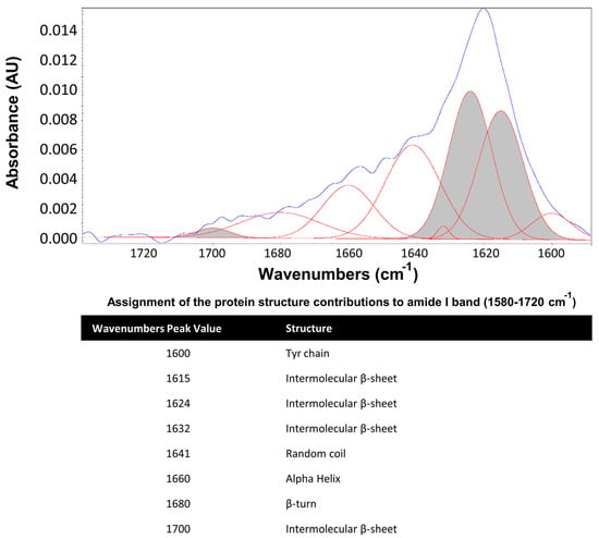 Secondary structure assignments of amide I band components in silk fibroin proteins. The amide I band region and the constituent resolved peaks are indicated as blue and red colors, respectively. The β−sheet area under the amide I band is in shaded gray.