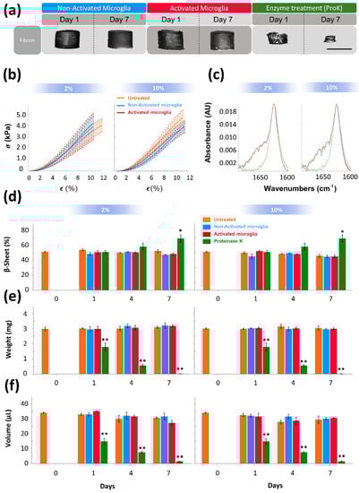 Silk fibroin hydrogels are resistant to activated BV2 microglial−derived medium. (a) Lateral view of SF hydrogels showing morphological changes at 1 and 7 days after incubation with a non−activated (blue) and activated (red) microglia−derived medium, or in the presence of proteinase K (green) (Scale bar 4 mm). (b) Stress−strain curves in untreated (orange line) and treated silk fibroin hydrogels seven days after incubation with non−activated (blue) or activated (red) microglia at low (2%) and high (10%) serum concentrations. The symbols σ and ε correspond with stress (in kPa) and strain (%) parameters, respectively. (c) Representative ATR−FTIR spectra of silk fibroin hydrogels incubated in untreated (orange line), non−activated (blue) or activated (red) microglia−derived medium, or in the presence of proteinase K (green). Note that degradation induced by proteinase K is associated with a reduction of absorbance in the regions corresponding to non-β−sheet structures. Percentage of β−sheet content (d), weight (e), and volume (f) in silk fibroin hydrogels across time after treatment. At least six samples were used per group. Data are shown as the means ± SEM. The asterisks denote the significant differences of different groups with respect to baseline (Day 0, untreated hydrogel). Statistical significance was determined via ANOVA and Tukey´s post hoc test (n = 6, * p < 0.05; ** p < 0.01).