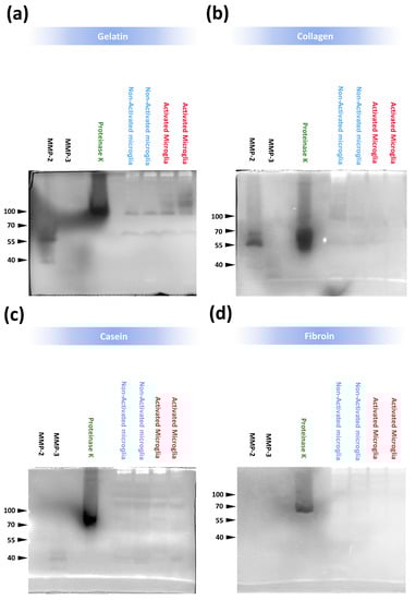 Zymography gels were conducted following previous methodologies []. Briefly, silk fibroin gels were fabricated at a concentration of 2 mg/mL. Parallel experiments were performed with gelatin (1.5 mg/mL), collagen (0.6 mg/mL), and casein (0.4 mg/mL) substrates. All gels were stabilized and polymerized in the presence of 8% Polyacrylamide gel (PAGE). The different substrates were incubated with a conditional medium derived from non-activated and activated microglia, proteinase K (Sigma Aldrich, P6556), or with recombinant Mouse/Rat MMP-2 (R&Dsystems, 924-MP, Minneapolis, MN, USA) and MMP-3 (R&Dsystems, 548-MM, Minneapolis, MN, USA). MMP-2 and MMP-3 were activated in the presence of 1mM of p-aminophenylmercuric acetate (Sigma Aldrich, A-9563, St. Louis, MO, USA) for 2 h at 37 °C. Protein samples were added to a sample buffer containing sodium dodecyl sulfate (SDS), glycerol, and bromophenol blue. Heating the samples was avoided to prevent protease inactivation, and electrophoresis was carried out under non-reducing conditions []. After electrophoresis (about 3 h at 110V at 5 °C), protein renaturation was promoted by washing the substrate gel with 2.5% of Triton X-100. Subsequently, the gel was incubated in Tris buffer pH of 7.4, 10 mM CaCl2, and 0.02% sodium azide for 54 h at 37 °C. Afterward, the gels were stained with Coomassie brilliant blue.