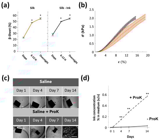 Silk fibroin hydrogels reconstituted with carbon ink showed unmodified gelation time course and equivalent mechanical properties compared to intact silk fibroin hydrogels. (a) Percentage of β−sheet in intact silk (orange) and silk reconstituted with ink (SF−ink) (black), in dope (initial SF protein dope before sonication), 6–12 h after sonication (timepoint of biomaterial gelation), and overnight (after incubation at 37 °C). Significant differences were analyzed with ANOVA followed by Tukey´s post hoc test compared to dope (three samples were used per group and time point, before and after sonication). (b) Stress–strain (σ, ε) curves of SF (orange) and SF reconstituted with carbon ink (black). (c) Representative top views of SF hydrogels reconstituted with ink and incubated in PBS (saline solution) or in the presence of proteinase K during 14 days of incubation. Note the progressive deterioration of SF−ink hydrogels and delivery of ink to the medium in the presence of proteinase K (scale bar 4mm). (d) Quantification of the amount of released ink in the solution in the presence and absence of proteinase K. Statistical significance was calculated by a two−way ANOVA with Tukey’s post hoc test compared to day 0 (at least three samples were used per group and temporal point). Data are shown as the means ± SEM. The asterisks denote significant differences between different groups with respect to dope (panel a) or basal condition (Day 0 in panel d); * p < 0.05; ** p < 0.01.