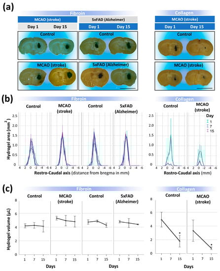 An in situ gelling silk fibroin hydrogel reconstituted with ink was injected into the striatum of healthy, MCAO (stroke), and 5× FAD (Alzheimer’s) mice. Histological studies from different brain coronal sections showed that the area occupied by the SF deposits across the rostrocaudal axis was relatively stable in the range of 1 (short-term) to 15 (mid-term) days after injection in both non-pathological and pathological animals (Figure 6). The quantification of total volume in the whole brain was similar between groups and relatively close to the injected volume (Figure 6a-left, Figure 6b-left, and Figure 6c-left). Although collagen hydrogels reconstituted with carbon ink showed very good in vitro stability disrupted only by proteinase K (Figure S5), collagen hydrogels rapidly disappeared in vivo in healthy and stroke mice (Figure 6a-right, Figure 6b-right, and Figure 6c-right).