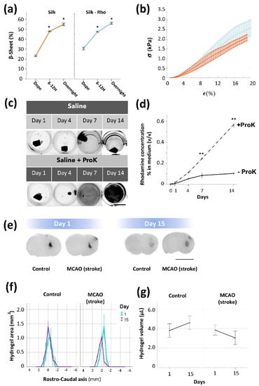 Degradability of silk fibroin hydrogels functionalized with rhodamine (SF-Rho) after stroke. (a) Percentage of β−sheet in intact silk (orange) and silk functionalized with rhodamine (blue), in dope (the initial SF protein dope before sonication), 6−12 h after sonication (time point of biomaterial gelation), and overnight (after incubation at 37 °C). (b) Stress–strain curves in non−modified SF (orange) and SF functionalized with rhodamine (SF−Rho) (blue). (c) Representative top views of silk fibroin hydrogels functionalized with rhodamine in the presence of PBS (saline solution) or proteinase K during 14 days of incubation. Images were captured in a fluorescent chamber. Note the progressive deterioration of SF−Rho hydrogels in the presence of proteinase K, with increasing fluorescence intensity in the medium (scale bar 10 mm). (d) Quantification of rhodamine released in solution in the presence or absence of proteinase K. (e) Representative coronal brain sections of healthy and MCAO (stroke) animals, at 1 and 15 days after implantation of SF−Rho (scale bar 5 mm). (f) Plots showing the hydrogel area across the rostrocaudal axis at 1 and 15 days after silk fibroin implantation (a minimum of four mice were used per group and temporal point). (g) Estimation of silk fibroin hydrogel volume in the brains of healthy and stroke mice over time after injection. Data are shown as the means ± SEM. In (panels a and d), the statistical significance was calculated by ANOVA followed by Tukey’s post hoc test. At least three samples were used per group and temporal point. The asterisks denote significant differences between different groups with respect to dope (panel a) or baseline condition (Day 0 in panel d); * p < 0.05; ** p < 0.01. In (panel g), statistical significance was examined by a Student’s t−test.