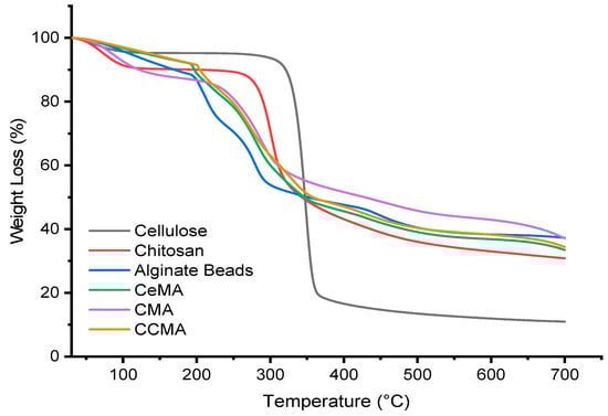 | Sample | Mass Ratio of Cellulose/Chitosan/Magnetite/Alginate | Inflection Point °C | Weight Loss at Inflection Point (%) | Mass Residual (%) at 700 °C |