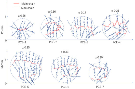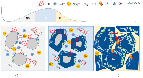 - Cement hydration kinetics: during the NG stage, the blank sample had the smallest n value and more needle-shaped products were formed, while the addition of PCE samples resulted in a larger n value and domination of C-S-H products, indicating a delay in the early stage of acceleration period. With the increase of carboxyl group density, PCE-4 had the smallest n value, and the nucleation amount was the smallest in the I process. With the increase of the main chain polymerization degree, PCE-7 had the largest n value, indicating that ion concentration had the greatest influence on its nucleation and growth agent.