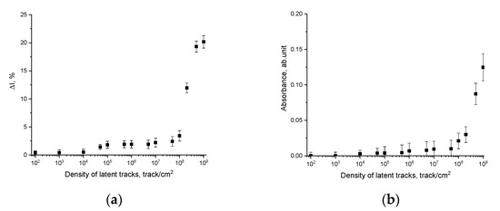 (a) Changes in the amplitude of oscillations of interference fringes ∆IT depending on the density of latent tracks; (b) change in the optical density value depending on the density of latent tracks.
