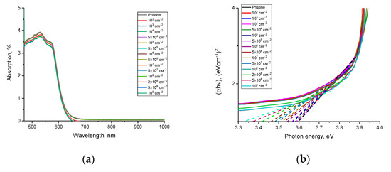 The general view of the optical absorption spectra is characterized by the presence of a wide spectral band in the region of 450–650 nm, with characteristic maxima of the spectral lines at 509 nm (2.43 eV) and 531 nm (2.33 eV), the presence of which can be explained by absorption centers. In this case, a change in the density of latent tracks results into a growth in the intensity of the spectral absorption bands with a slight shift of the maxima, which indicates a change in the concentration of absorbing centers. Based on the obtained optical absorption spectra using Tauc plots, the values of the band gap were calculated. The results of the constructions are shown in Figure 7b.