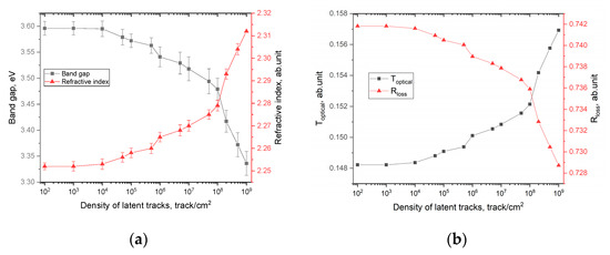 (a) Results of changes in the band gap and refractive index; (b) data on changes in Toptical and Rloss values depending on the density of latent tracks.
