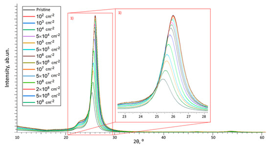 Figure 9 shows X-ray diffraction patterns that reflect changes in the intensity and position of the main diffraction peak with a maximum of 2θ = 25.8°, which characterizes the crystalline component of the polymer film used as a nuclear-tracking detector. X-ray diffraction patterns were taken in the Bragg–Brentano geometry, in the angular range 2θ= 10–60°, reflecting changes in the polymer film and characterizing its crystalline and amorphous components of the polymer.