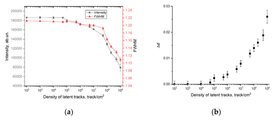 (a) Estimation results of the change in the intensity of the diffraction reflection at 2θ = 25.8° and its FWHM depending on the density of latent tracks; (b) estimation results of the change in the value of Δd depending on the density of latent tracks.