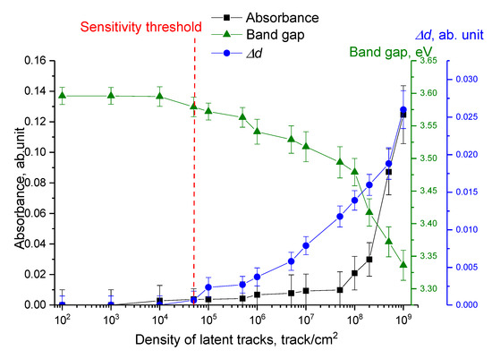 As is evident from the data presented, alterations in the optical and structural parameters correlate quite well with each other, and the structural changes in the Δd value and the band gap width have a common trend of changes. Moreover, by comparing the structural and optical changes, it is possible to determine the sensitivity threshold of these analysis methods, which amounted to 104 track/cm2, i.e., at latent track densities below this threshold, no change in the optical and structural characteristics of the polymer is observed. If the density of latent tracks exceeds this value, the changes in the optical and structural characteristics are clearly distinguishable, and by their changes it is possible, using the dependences in Figure 11, to determine the density of latent tracks, and to establish the concentration dependences of radon and its daughter decay products.