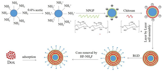 The CS/NGPG multilayers were assembled on the SiO2-NH2 nanospheres by the LbL deposition technique [16,26]. SiO2-NH2 (0.5 g) was ultrasonically dispersed in 50 mL of 0.4% acetic acid solution (ultrasonic power 120 w, frequency 53 Hz, time 20 min), and then the dispersion was added to the pectin (1 mg/mL, 50 mL, pH 3.0) with magnetic stirring, followed by centrifugation of the nanospheres (10,000 rpm/min, 10 min) after stirring for 1 h. The excess polyanionic polysaccharide was removed by three cycles of centrifugation (10,000 rpm/min, 10 min) with pure water washing. As described above, the NPGP/CS bilayer construction was performed by dropwise adding the nanosphere dispersion solution to the CS solution (1 mg/mL in 0.4% (v/v) acetic acid solution). The alternate deposition of CS and NPGP was repeated until the deposition of 7 layers. The synthesized nanospheres were labeled as SiO2(NGPG/CS)3NPGP nanospheres.