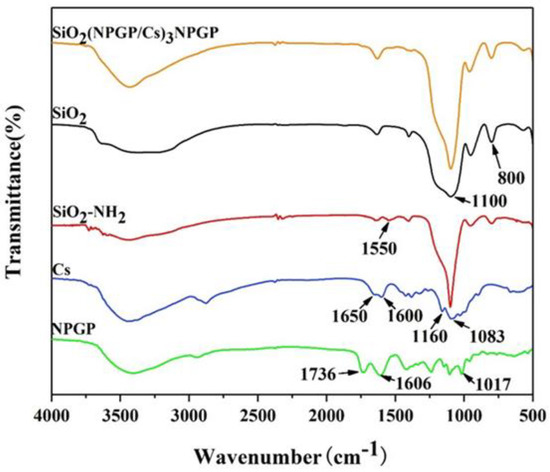The chemical characteristics of SiO2, SiO2-NH2, NPGP, CS, and SiO2(NGPG/Cs)3NPGP were analyzed by FT-IR. As shown in Figure 4, the IR spectra of SiO2 before and after amino modification were basically consistent. The peaks near 1100 cm−1 and 800 cm−1 were the asymmetric contraction vibration peak and symmetric expansion vibration peak of Si-O-Si, respectively [30]. The absorption peak of SiO2 after modification at 1550 cm−1 was attributed to the symmetric bending vibration absorption peak of amino [31]. The results showed that APTES had been successfully grafted onto the surface of SiO2 nanospheres. In the IR of chitosan, the absorption peaks in the range of 3000 cm−1 to 3700 cm−1 are the characteristic peaks of -OH and -NH2. The peaks at 2867 cm−1 were the characteristic peaks of -CH2-, -CH3; the extension and contraction vibration of C=O (the non-deacetylated amide group on chitosan) was at 1650 cm−1; the characteristic peak of -NH2 was at about 1600 cm−1; and the absorption peaks at 1083 cm−1 and 1160 cm−1 were corresponding to C-O-C on the chitosan sugar rings [32]. For NPGP, 3400 cm−1 had a strong characteristic absorption band of -OH stretching vibration, 2950 cm−1 was the C-H stretching vibration absorption peak, 1017 cm−1 was the stretching vibration of cyclic ether C-O-C of polysaccharide, and the absorption peaks at 1736 cm−1 and 1606 cm−1 were the C=O stretching vibration peaks of methylated and unmethylated carboxyl groups, respectively. Compared with the IR of chitosan and NPGP, the absorption peak intensities of SiO2(NPGP/CS)3NPGP nanospheres in the range of 1600 cm−1–1700 cm−1 were weakened in the IR spectra, indicating that the electrostatic interaction between the amino group and ionized carboxyl group was the main driving force for the formation of nanospheres by the alternating precipitation of NPGP and chitosan on amino SiO2 [33].