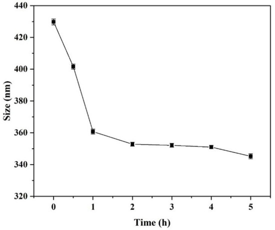 The erosion rate of the SiO2-NH2 template depends on reaction time. As shown in Figure 5, the particle size of SiO2(NGPG/CS)3NPGP treated with HF-NH4F buffer solution decreased with the increase in reaction time. Within 1 h after the addition of HF-NH4F buffer, the particle size of the nanoparticles decreased significantly, which was due to the rapid disintegration of SiO2-NH2 template particles, which made the nanoparticles hard to support, so that the cyst wall contracted. After more than 1 h, the particle size was virtually unchanged with the increase in reaction time, and we can conclude that the template removal is almost complete and the nanoparticles are formed. In Figure 6, the overall hollow cavity and polysaccharide layer with a rough surface of the nanoparticles were clearly visible, but obvious black SiO2 particles could not be seen inside. The nanoparticles had certain shrinkage and adhesion but basically maintained their spherical shape.