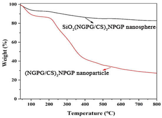 TGA thermograms of SiO2(NGPG/CS)3NPGP nanospheres and (NGPG/CS)3NPGP nanoparticles.
