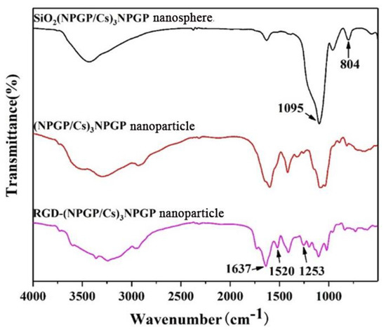 By comparing the IR of SiO2(NGPG/CS)3NPGP nanospheres and (NGPG/CS)3NPGP hollow nanoparticles (Figure 8), it was found that the asymmetric contraction vibration peak of Si−O−Si was significantly weakened at 1095 cm−1, and the symmetric expansion vibration peak of Si-O-Si disappeared at 804 cm−1. All these changes indicated that the template SiO2−NH2 was successfully eroded, and the hollow nanoparticles were successfully built. The spectra after grafting with RGD peptide showed that the C=O stretching vibration absorption peak at 1637 nm−1 in RGD-(NGPG/CS)3NPGP and the new absorption peaks at 1520 nm−1 and 1253 nm−1 were the characteristic absorption peaks of N−H and the C−N stretching vibration peak of RGD peptide [35,36,37], indicating that the RGD peptide was successfully grafted onto the surface of nanoparticles.