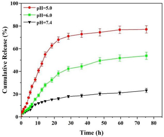 Among various stimulation-responsive controlled release systems, pH-responsive drug delivery systems have a broad application prospect because the tumor microenvironment exhibits low pH, especially intracellular bodies (pH = 5.0–6.0) and lysosomes (pH = 4.5–5.0) [39]. In this study, the release behavior of DOX-loaded RGD-(NGPG/CS)3NPGP nanoparticles in a release medium with pH at 7.4, 6.0, and 5.0 was investigated individually. As shown in Figure 9, DOX exhibited multiple release behaviors at different pHs, and the release rate increased with the decrease in pH. In 75 h, only approximately 23.22% of DOX was released in a physiological microenvironment with a pH of 7.4. The total drug release in the medium at pH 6.0 was about 53.73%. At pH 5.0, the drug release within 10 h was 40.71%, and the cumulative release within 48 h was 74.41%. Therefore, RGD-(NGPG/CS)3NPGP nanoparticles showed pH-responsive properties. It should be noted that in the process of release, due to the time difference between the diffusion of DOX from inside the dialysis bag to outside the band, there is also a small amount of free DOX lost in the dialysis bag, which leads to the loss of part of the DOX in the process of release. Due to the dilution effect of the dialysis system, the actual release amount is slightly larger than that measured, but the overall trend remains unchanged.