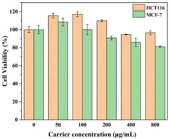Cell viability of HCT116 and MCF-7 cells after 48 h of incubation with nanoparticles at different concentrations (the data was expressed as mean ± SD, n = 3).
