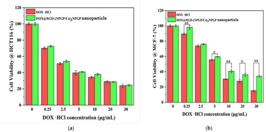 Anticancer activity of free DOX and DOX@RGD-(NPGP/CS)3NPGP nanoparticles against HCT-116 cells (a) as a function of DOX concentration after 48 h incubation; anticancer activity of free DOX and DOX@RGD-(NPGP/Cs)3NPGP nanoparticles against MCF-7 cells (b) as a function of DOX concentration after 48 h incubation. (** p < 0.01, * p < 0.01).