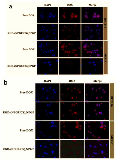 The uptake of RGD-(NGPG/CS)3NPGP nanoparticles by tumor cells HCT-116 and MCF-7 was observed by CLSM. HCT-116 cells showed high expression of the integrin receptor on the surface, while MCF-7 cells showed low expression. Therefore, these two cells were used to further investigate the targeting of nanoparticles. In Figure 12, blue represents the nucleus, red represents DOX, and merged is the overlaid picture of the former two.