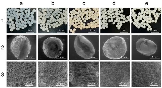 Gfr immobilization on hybrid materials. (1) Macroscopic appearance of (a) A4. (b) A4M1. (c) A4M4. (d) A4S1. (e) A4S4. (2) Scanning electron microscopy image (100×) of (a) A4. (b) A4M1. (c) A4M4. (d) A4S1. (e) A4S4. (3) Scanning electron microscopy image (1600×) of (a) A4. (b) A4M1. (c) A4M4. (d) A4S1. (e) A4S4.