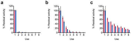 Reusability evaluation of Gfr-based biocatalysts. (a) Repeated conversion of pure glycerol using resting cells. (b) Repeated conversion of pure glycerol using A4 immobilized preparations. (c) Repeated conversion of pure glycerol using A4S4 immobilized preparations. Residual GA production activity (red), residual DHA production activity (blue). Each use lasted 24 h.