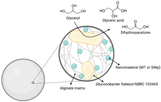 Pure glycerol conversions with resting cells in shake flasks were carried out as described in previous work using starting glycerol concentrations of 200 g/L in water [23]. Glycerol conversions with immobilized preparations were carried out in 250 mL Erlenmeyer flasks containing 30 mL of 200 g/L glycerol in water. The inoculum of each reaction was 20 mg DCW immobilized in 3 mL of 3% agar or agarose (AR3 and AE3, respectively), 3 mL of 4% alginate (A4), 4% alginate + MT 1% (A4M1), 4% alginate + MT 4% (A4M4), 4% alginate + SiNps 1% (A4S1), or 4% alginate + SiNps 4% (A4S4). Samples were periodically withdrawn from the reactions and analyzed by HPLC. The turbidity of the reaction medium was determined by spectrophotometry at 600 nm using a Shimadzu UV-1800 spectrophotometer (Kyoto, Japan).