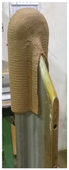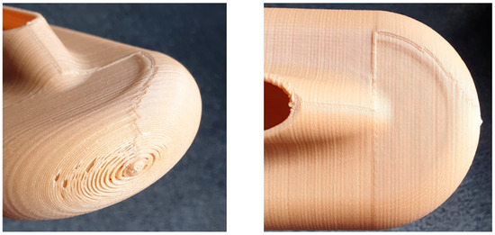 Figure 20 presents the visible imperfections of the 3D printed sample using the bio-based polymer. This technology provides voids at curved surfaces, which might be problematic due to the lower dielectric withstand of these areas and partial discharge phenomena. Additionally, the non-uniform structure might be problematic, with the development of a discharge process at interfaces.