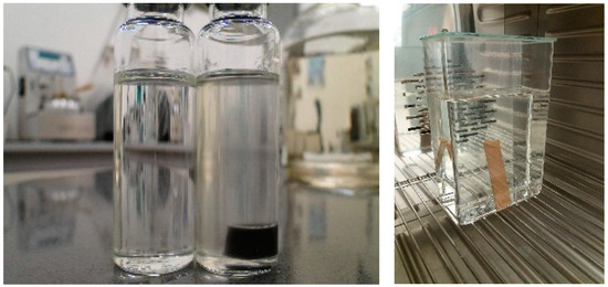 Before the material was placed in the exposure vessel, it was rinsed with a portion of the prepared oil, which was discarded. The material was then placed in the vessel and oil was added in such an amount that the relation between panel surface area/weight and oil volume became 10 times higher than that under service conditions. The vessels were covered with aluminum foil and then exposed to 90 °C for 7 days (Figure 3).